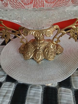 Elegante centro de mesa con detalles en bronce y cristal. - Diseño intrincado en el cristal. - Asas decorativas en bronce.