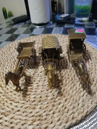 Conjunto de tres carruajes en miniatura. - Fabricados en latón. - Diseño detallado de carruajes y caballos.