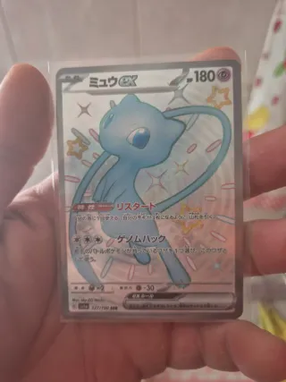 Carta Pokémon EX de Mew en su versión Shiny. La carta tiene 180 puntos de salud. - Habilidad: Reinicio - Ataque: Genoma Hack - Ilustrador: sky CG Works - Número de carta: 327/190