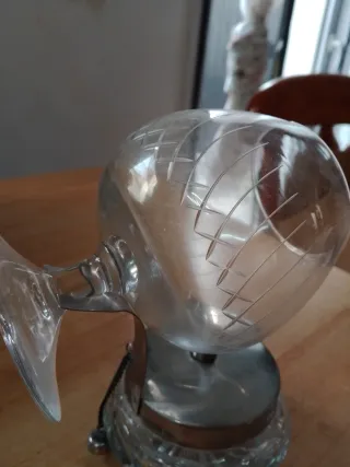 Calentador de coñac español vintage con copa de cristal tallada. - Copa de cristal con diseño grabado. - Base del calentador de cristal tallado. - Tapa metálica plateada.