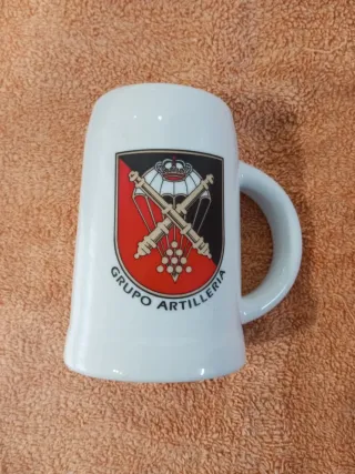 Jarra de cerámica blanca con el emblema del Grupo de Artillería de la Brigada Paracaidista.taza militar ejercito - Diseño con escudo y corona. - Texto GRUPO ARTILLERIA en la base.