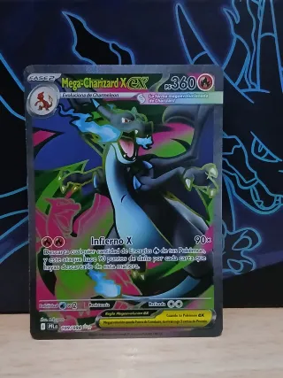 Carta Pokémon de Mega-Charizard X EX. - Fase 2. - Evoluciona de Charmeleon. - Ataque Infierno X con 90 puntos de daño por cada carta descartada. - Debilidad x2. - Resistencia. - Retirada. - Regla Megaevolución EX.