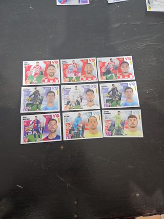 Lote de cromos de LaLiga 2025-26. Son 31 cromos. Incluye cromos de jugadores de FC Barcelona, Levante U.D. y Girona FC. - Cromos de Sivera, Gazzaniga y Lunin. - Diseño con fondo morado y naranja. - Incluye escudos de los equipos. Venta en persona