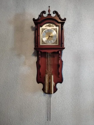 Este es un reloj de cuco antiguo, una pieza decorativa con un diseño clásico. - Fabricado en madera. - Incluye péndulo y pesas decorativas.