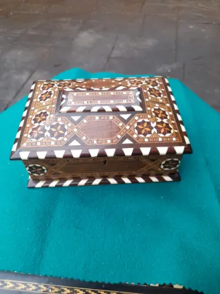 Preciosa caja antigua realizada con la técnica de la taracea. - Elaborada con maderas nobles. - Diseño geométrico intrincado. - Pieza decorativa única En buenestadodeconservacióPrecio No Negociable.