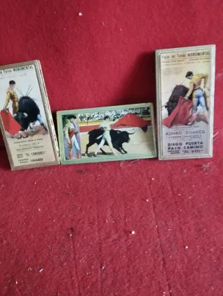 Conjunto de tres cajetillas de cerillas con temática taurina. - Ilustraciones de plazas de toros y toreros. - Incluye Plaza de Toros Monumental y El Cordobés. - Diseños con nombres de toreros como Álvaro Domecq y El Viti.