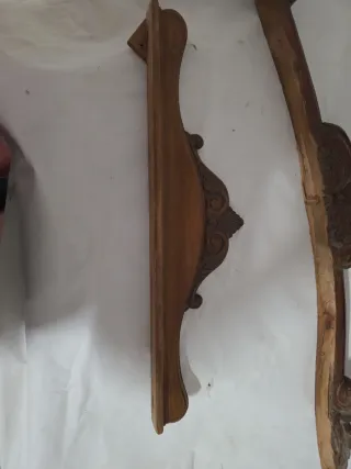 Conjunto de copetes decorativos para muebles, elaborados en madera con detalles tallados. - Pieza superior oscura con ornamentación. - Dos piezas de madera clara con diseño curvo y tallado.