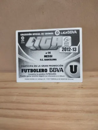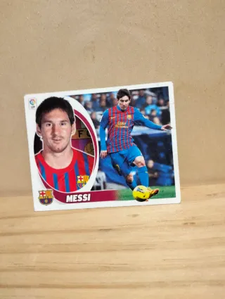 Cromo de Leo Messi del FC Barcelona, sin pegar y en perfecto estado. - Imagen de Messi en acción. - Incluye escudo del FC Barcelona. - Diseño con el nombre 'Messi' en la parte inferior.