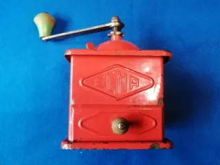 Molino de café vintage de la marca Elma, con un diseño clásico y un vibrante color rojo. - Cuerpo metálico de color rojo. - Detalle del logo 'ELMA' en relieve. - Cajón extraíble con pomo de madera. - Manivela con pomo verde otro verde de las mismas características y otro de madera el precio es por Unidad el precio no es negociable no hago envios
