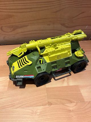 Vehículo militar de juguete de la línea Gi Joe de 1992. Este modelo presenta un diseño robusto y detallado, con una torreta principal y armamento secundario. - Color verde militar con detalles en amarillo. - Ruedas todoterreno. - Calcomanías de Gi Joe y Mega Marines.