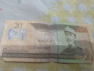 Billete de 20 pesos oro de la República Dominicana, año 2003. Presenta el retrato de Gregorio Luperón. - Serie: JS8208986 - Banco Central de la República Dominicana - Diseño con motivos ornamentales y texto VEINTE PESOS ORO. Precio a consultar.