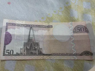 Billete de cincuenta pesos oro de la República Dominicana. - Banco Central de la República Dominicana. - Diseño con la Basílica de Nuestra Señora de la Altagracia. - Denominación: 50. - Texto: CINCUENTA PESOS ORO. Precio a consultar