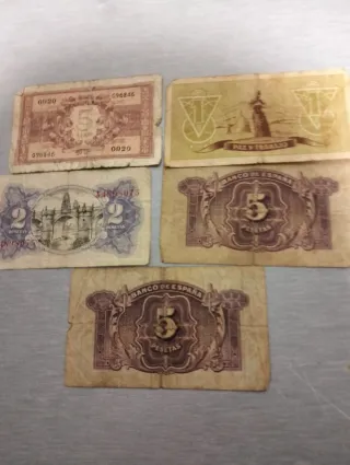 Conjunto de cinco billetes antiguos de colección. - Un billete de 5 Lire italianas. - Un billete de 1 Peseta de Consejo de Asturias y León. - Un billete de 5 Pesetas de República Española, emisión 1938. - Dos billetes de 5 Pesetas de Banco de España, emisión 1935.