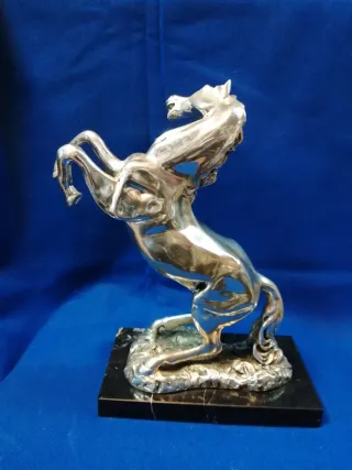Figura decorativa de un caballo en metal con baño de plata. La base es de mármol negro. - Diseño detallado del caballo. - Base de mármol. - Acabado plateado el precio no es negociable no hago envíos