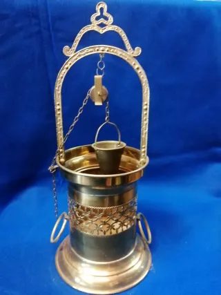 Este pozo decorativo está hecho de metal y tiene un diseño antiguo. - Estructura de metal dorado. - Incluye cubeta y polea. - Detalles ornamentales en la base y el arco el precio no es negociable no hago envíos