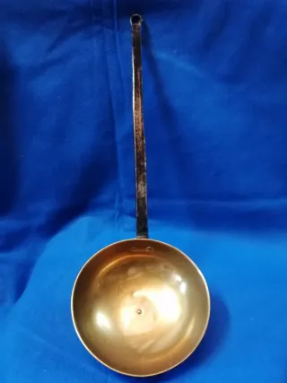 Antiguo cazo aguacero con mango largo. - Material: latón. - Mango: negro el precio no es negociable no hago envíos