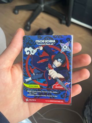 Carta de Itachi Uchiha del juego de cartas coleccionables Naruto Mythos TCG. - Número de carta: 128/130 A. - Personaje: Itachi Uchiha. - Habilidad principal: Reduce el poder de los enemigos. - Habilidad de mejora: Permite mover un personaje amigo.