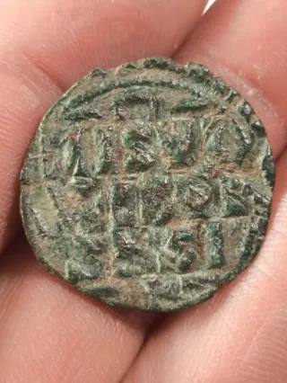 Moneda bizantina de bronce, tipo follis anónimo. Lote número 118 del album 2 - Representación de figura imperial. - Inscripción parcial visible.