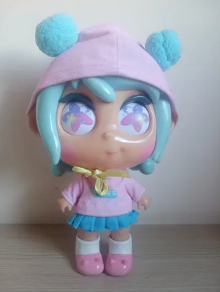 Muñeca Trotie con un divertido gorro rosa adornado con dos pompones azules. - Gorro con diseño de orejas. - Vestido rosa con falda azul. - Zapatos rosas con detalles blancos.