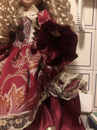 Preciosa muñeca de porcelana con un elegante vestido de época. - Vestido de satén rojo con detalles dorados. - Encaje en cuello y mangas. - Peluca rubia rizada. - Sombrero a juego.