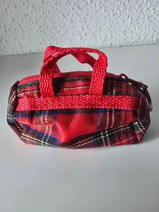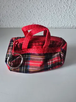 Original llavero con forma de bolso pequeño. - Diseño de cuadros escoceses en tonos rojos, negros y amarillos. - Asa y cremallera en color rojo. - Incluye anilla metálica para llaves.