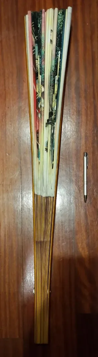 Abanico artesano pintado a mano Origen: Chiang Rai, norte de Tailandia. 90 cm La madera es de bambú, la tela ni idea. Precioso abanico decorativo con una escena pintada a mano de Tailandia. Representa un paisaje fluvial con casas sobre pilotes y barcas. - Pintura detallada de estilo asiático. - Colores vibrantes y degradados suaves. - Estructura de madera.