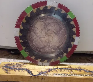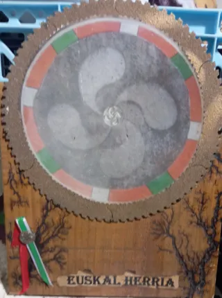 Disco de sierra decorado con motivos vascos. Una pieza única de artesanía. - Diseño con los colores de la ikurriña. - Grabado central. - Base de madera con diseño de rayo.