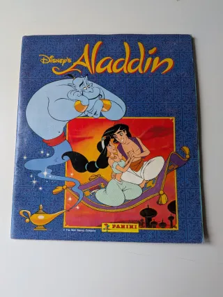 Álbum de cromos de Aladdin de Disney, publicado por Panini en 1992. Se encuentra completo. álbum original de la película de 1992 - Ilustraciones clásicas de la película. - Diseño con el Genio y la alfombra mágica.