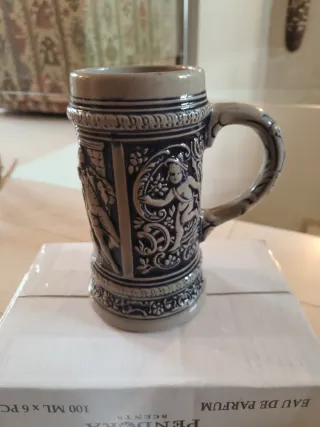 Jarra de cerveza de estilo austriaco, con un diseño detallado y un asa. - Cerámica con relieve. - Decoración en azul y gris