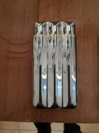 Elegante porta puros con un diseño acanalado y detalles dorados.Para Tres puros - Material: Metal - Color: Plateado - Acabado: Brillante