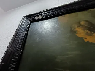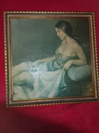 Precioso cuadro antiguo pintado al óleo. - Representa a una mujer sentada junto a un cuerpo de agua. - Marco negro con detalles ornamentales. Medidas 76x88. Tal y como se ve en la foto . Escucho ofertas o cambios