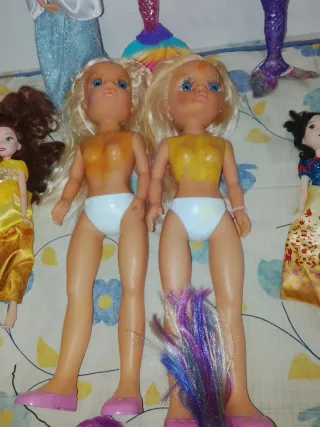 Lote variado de muñecas, incluyendo modelos tipo Nancy y personajes de Disney. - Muñeca estilo Nancy con vestido amarillo. - Muñeca estilo Nancy con bikini blanco. - Muñeca estilo Nancy con bikini naranja. - Muñeca estilo Disney con vestido azul y cola de sirena. - Muñeca estilo Disney con cola de sirena y top rosa. - Muñeca estilo Disney con vestido blanco y estampado. - Muñeca pequeña con pelo morado. - Figura de animal pequeño.