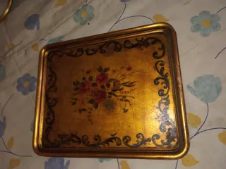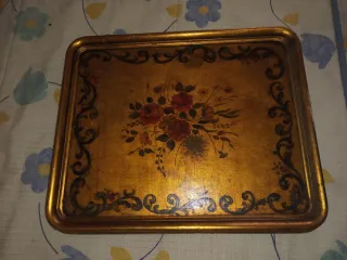 Elegante bandeja vintage con un diseño florentino. - Acabado dorado con detalles florales pintados. - Marco decorado con motivos ornamentales. - Superficie con un acabado craquelado que le da un toque antiguo.