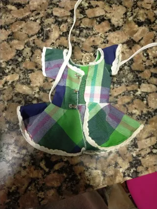 Vestido de estilo industrial para muñeca Nancy,, de Macla. Una versión del conjunto "Japones". Necesita repasar automáticos. - Diseño a cuadros en tonos verdes y azules. - Ribete blanco festoneado. - Incluye cintas para atar.