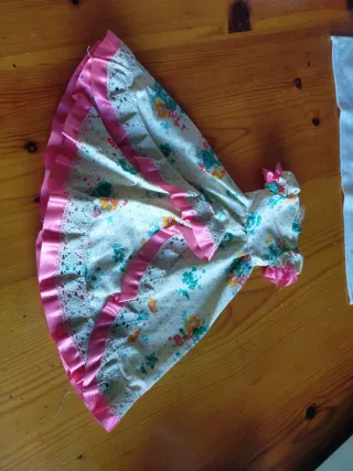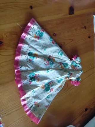 Vestido para muñeca Nancy, con un diseño industrial. De creaciones Marco. - Parte superior blanca. - Falda rosa con estampado floral en azul y rojo.