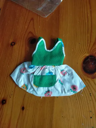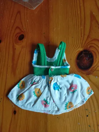 Vestido de tela con estampado floral, ideal para muñecas Nancy. Industrial, desconozco si de Marco macla o ninua - Cuerpo superior verde. - Falda blanca con flores rosas y azules. - Bolsillo delantero verde.