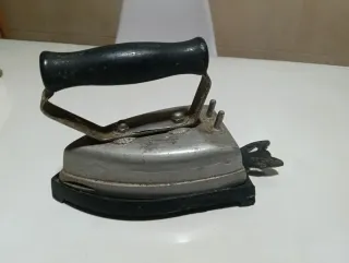 Plancha antigua de metal con mango negro. - Diseño clásico. - Material metálico resistente. Plancha de los años 50 con signos de deterioro por su antigüedad. Útil como objeto decorativo.