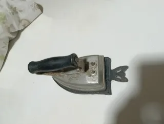 Plancha antigua de metal con un diseño clásico y un mango de madera. - Base de metal. - Mango de madera. - Detalles metálicos.