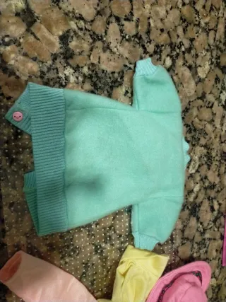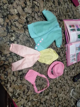 Conjunto de ropa Nancy de los años 90. Incluye varias piezas para vestir a la muñeca. - Chaqueta de color verde menta con botones rosas. - mono amarillo y rosa - Sombrero rosa con detalle floral. - Bolso rosa.