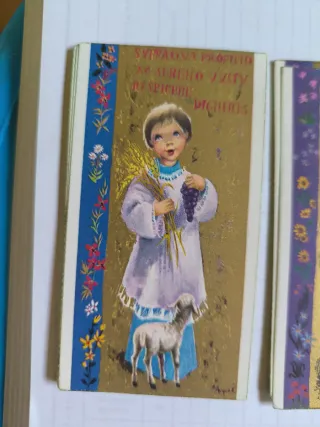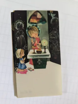 Conjunto de estampas con motivos infantiles, ideales como recordatorio de comunión. - 6 diseños diferentes - Diseño con figuras de niños y elementos religiosos. - Impresiones a color sobre fondo dorado. - Texto en latín en algunas de las estampas.