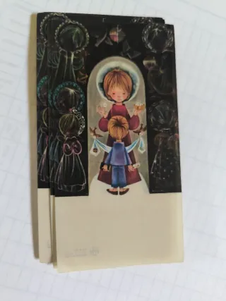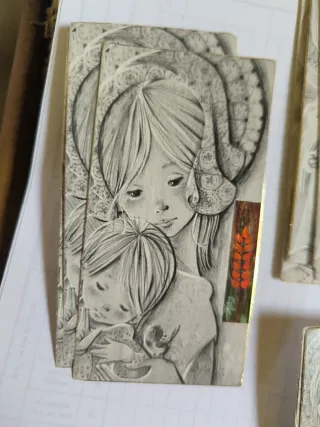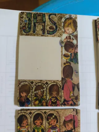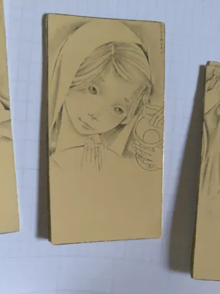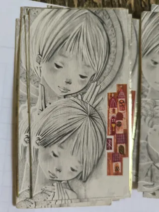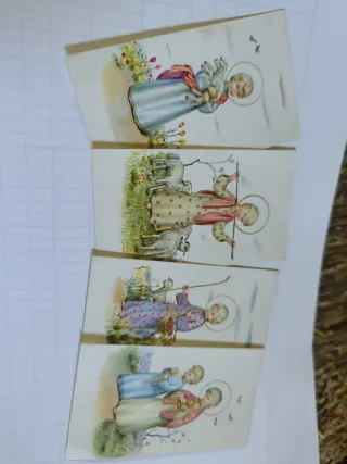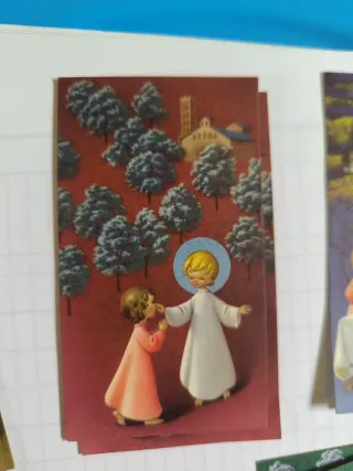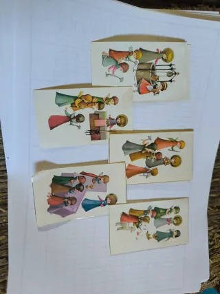 Conjunto de estampas con ilustraciones infantiles, ideales para comuniones o como decoración. - Diseño vintage con figuras de ángeles y niños. - Colores pastel y trazos delicados. - Cada estampa tiene un tamaño de tarjeta