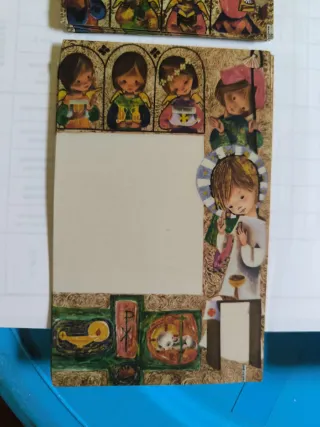 Conjunto de cinco estampas con ilustraciones infantiles. - Diseño con niños y motivos decorativos. - Ideal para coleccionismo o manualidades.