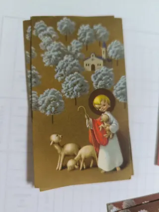 Conjunto de postales con diseño religioso. - Ilustración de un niño pastor con ovejas. - Detalle de una iglesia en el fondo. - Tonos dorados y pastel.