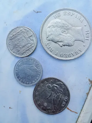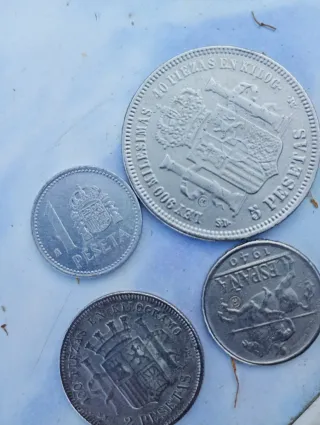 Conjunto de cuatro monedas antiguas de pesetas españolas. Incluye piezas de diferentes años y valores. - Moneda de 1 peseta. - Moneda de 5 pesetas. - Moneda de 2 pesetas. - Moneda de 100 pesetas. 647301019