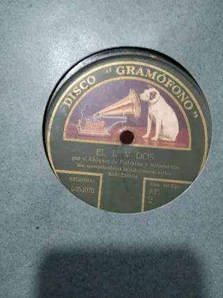 Disco de pizarra antiguo de Gramófono. - Título: El U y Dos - Artistas: El Ceget de Marchelenas y Concha Tamarit - Acompañamiento de instrumentos varios - Grabación regional de Barcelona - Número de catálogo: 0264079 / AF. 2 Disco de 30cm.