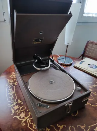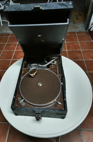 Gramófono de maleta antiguo fabricado en Inglaterra en los años 30, de la prestigiosa marca His Master’s Voice.Un objeto decorativo con un diseño clásico. - Funciona correctamente. - Mecanismo de plato giratorio. - Brazo fonocaptor metálico. - Tapa superior abatible. - Se regalan 5 discos