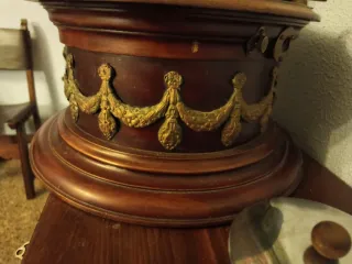 Base de madera para gramófono antiguo. Presenta un diseño clásico con detalles ornamentales. - Base de madera oscura. - Adornos dorados en el cuerpo.