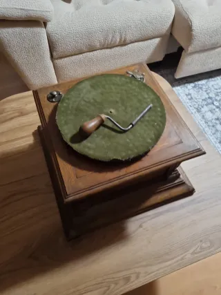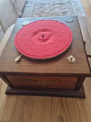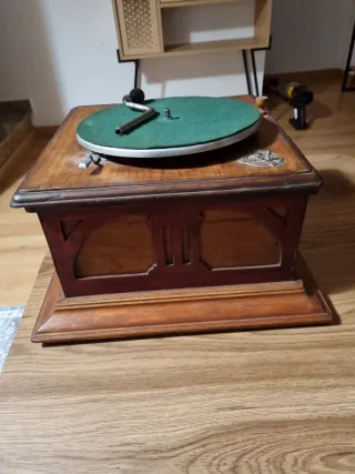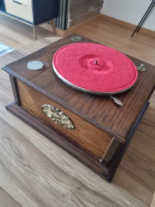 Mueble–gramófono clásico de principios del siglo XX, fabricado en madera maciza, con tapa superior abatible y sistema de reproducción mecánico a manivela. En su interior conserva: Plato giratorio para discos de pizarra (78 rpm) Brazo metálico original Compartimentos interiores para almacenamiento de discos Manivela lateral original El mueble presenta pátina y desgaste coherentes con su antigüedad, lo que refuerza su autenticidad y carácter decorativo. Pieza muy decorativa, ideal tanto como objeto funcional restaurable como elemento de ambientación vintage.