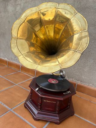 Preciosa pieza de colección. Un gramófono antiguo en estupendas condiciones. Ideal para decoración o amantes de la música vintage. - Gramófono antiguo con bocina de metal. - Mecanismo de cuerda. - Caja de madera de color marrón oscuro. - Plato giratorio de color verde. Está en la provincia de Pontevedra.
