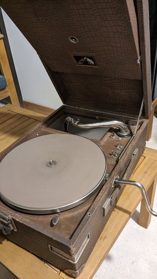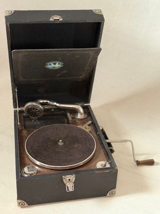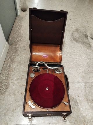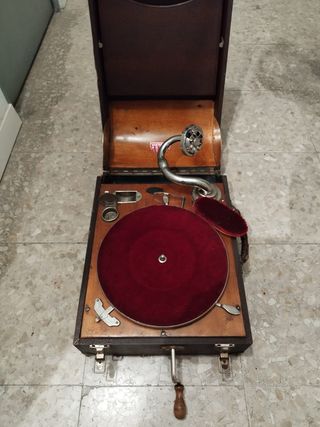 Gramófono antiguo de la marca Victoria Royal. Un objeto clásico para coleccionistas. - Diseño portátil con tapa. - Plato giratorio con alfombrilla de terciopelo rojo. - Brazo fonocaptor metálico. - Manivela para dar cuerda. - Tiene todos los accesorios Escucho ofertas